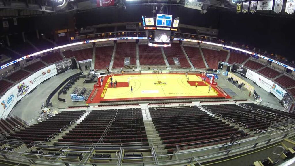 Casey’s Center is situated at 233 Center Street (also listed as 730 Third Street in some references) in Des Moines, Iowa, and forms an integral part of the Iowa Events Center, which encompasses the Community Choice Convention Center and EMC Expo Center. The arena is owned by Polk County and managed by OVG360, a division of Oak View Group. Its central downtown location provides connectivity via the city’s Skywalk system, enabling protected pedestrian access from nearby parking structures, hotels, and dining establishments.